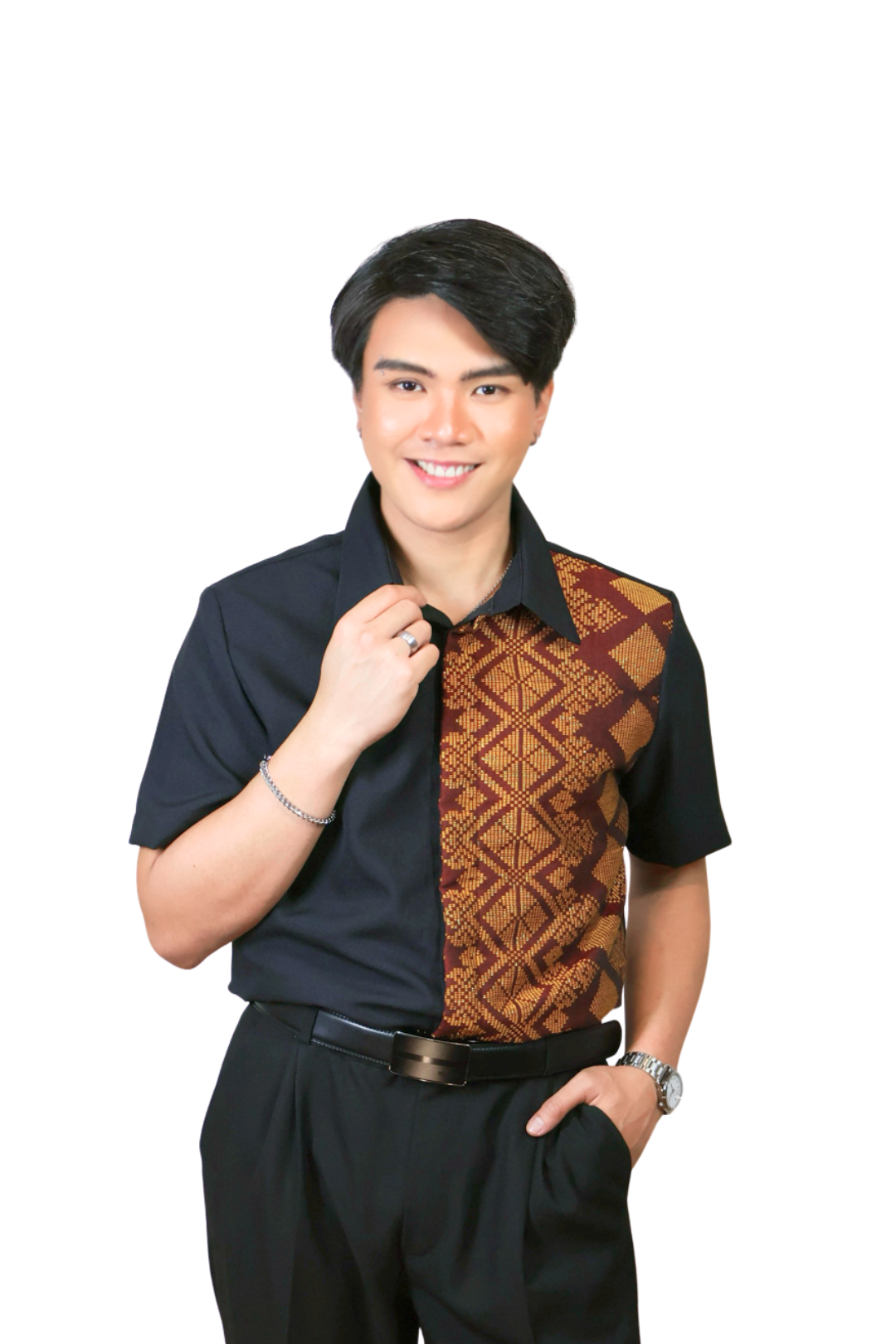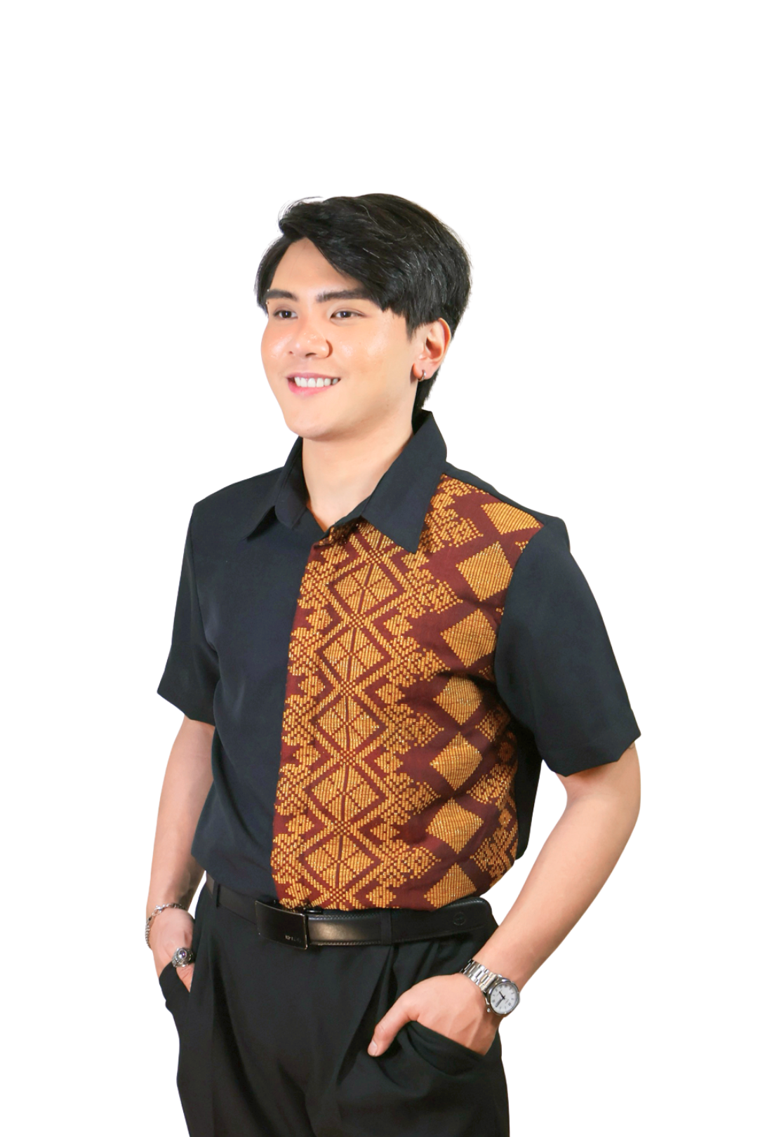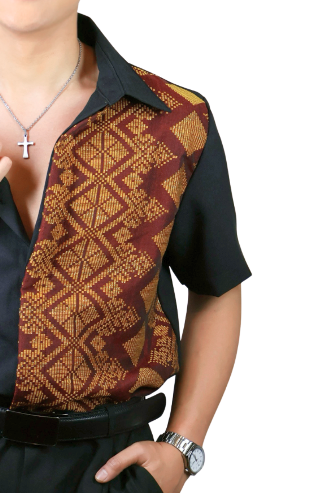 A modern piece built on the foundation of tradition. Made from soft black cotton, its full left panel showcases intricate woven fabric, creating a bold contrast that symbolizes heritage and structure.
